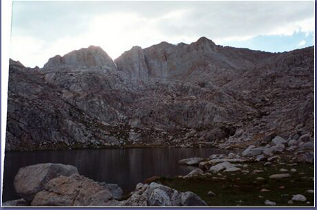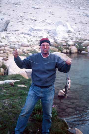 This was the day we had intended to climb Mt. Whitney. We got up before dawn and hit the "trail." We went past two or three lakes to Crabtree Pass where we were going to cross and traverse over to Whitney pass and on to the summit. The only trouble was that the "traverse" was blocked by cliffs and bluffs; we never would have gotten over them by dark much less gotten back that day. We decided some more fishing would be in order.